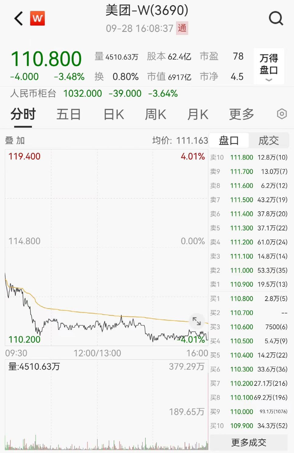 9月28日,美团股价低开低走,一度跌4.01%,随后跌幅收窄,最终收于110.8港元,跌3.48%。美团中报披露公司上半年扭亏为盈。另据港交所资料,董事长兼首席执行官王兴过去一个月合计减持公司股票超3000万港元。
