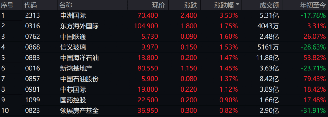 涨幅方面,申洲国际涨3.53%,东方海外国际涨1.75%,中国联通涨1.60%,领涨中概股。油气股上涨,联合能源集团涨超7%,中国海油、中国石油涨超1%。芯片半导体盘中拉升,中芯国际、华虹半导体等录得上涨。