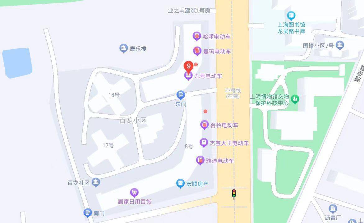 以惊蛰研究所所在的上海市徐汇区为例,在百度地图搜索“电动车”可以得到96个相关结果,而徐汇区54.93平方公里的面积内仅有12个街道1个镇。在位于龙吴路的百龙小区东门不到200米的路边,更是盘踞了包括雅迪、爱玛、九号、台铃、哈啰在内的共计10家电动车品牌门店。