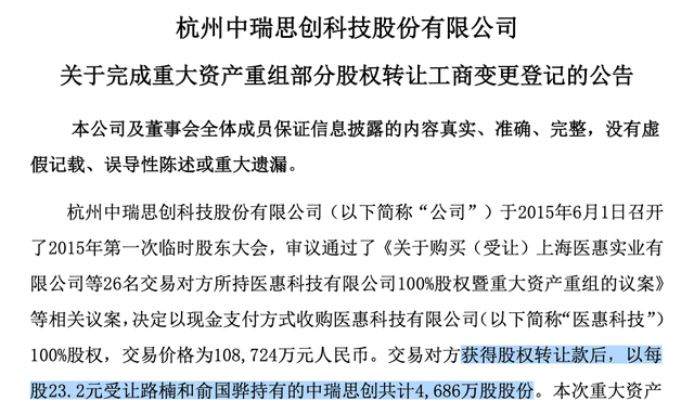 交易完成后,10.87亿元兜了个圈子回到路楠、俞国骅手上,而章笠中将医惠科技装入上市公司,拿到上市公司股权,成为股东。