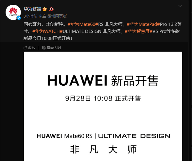 消息面上,华为Mate 60 RS非凡大师、华为MatePad Pro 13.2英寸、华为WATCH ULTIMATE DESIGN非凡大师、华为智慧屏V5 Pro等多款新品今日10:08正式开售。官网显示,刚开售不久Mate 60 RS就已处于缺货状态。