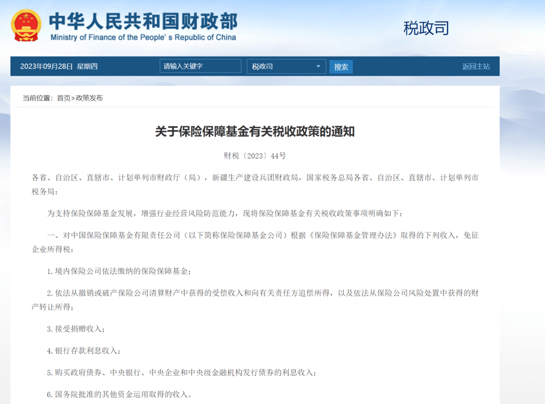 扬子晚报网9月28日讯(记者 马燕)据财政部官网,财政部、税务总局发布通知,对中国保险保障基金有限责任公司根据《保险保障基金管理办法》取得的下列收入,免征企业所得税: