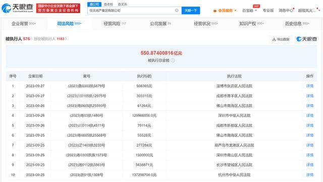 目前,恒大多家公司均存在被执行人、失信被执行人(老赖)、限制消费令、终本案件等风险信息。其中,在港股上市的中国恒大集团存在7条被执行人信息,被执行总金额超72亿元。作为恒大在内地支柱企业之一的恒大地产集团有限公司存在570余条被执行人信息,被执行总金额超550亿元。
