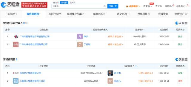 此外,曾任职信息显示,许家印曾担任恒大地产集团有限公司董事长、长春开元集团有限责任公司董事长等。