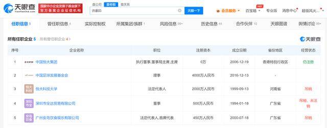 许家印目前共关联5家企业或社会组织,其中2家为存续状态,除在港股上市的中国恒大集团外,还包括中国足球发展基金会,许家印担任理事。