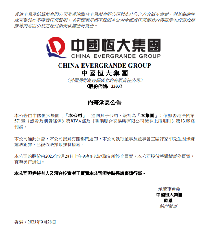 28日晚间,中国恒大在港交所公告,公司接到有关部门通知,公司执行董事及董事会主席许家印因涉嫌违法犯罪,已被依法采取强制措施。中国恒大表示股份将继续暂停买卖,直至另行通知。