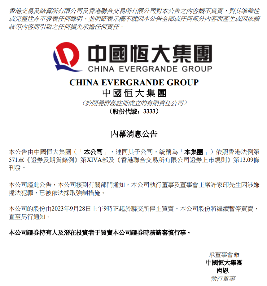 今晚中国恒大发布公告称,许家印因涉嫌违法犯罪,本公司接到有关部门通知,本公司执行董事及董事会主席许家印先生因涉嫌违法犯罪,已被依法采取强制措施。本公司的股份由2023年9月28日上午9时正起于联交所停止买卖。本公司股份将继续暂停买卖,直至另行通知。