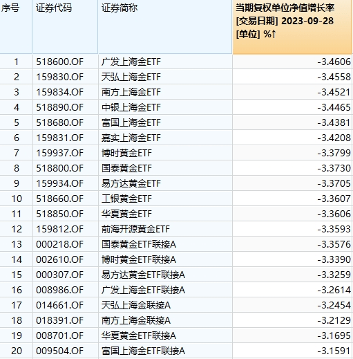 跌幅榜方面,原本全市场来看,领跌的是一众黄金ETF,跌幅在3%以上。