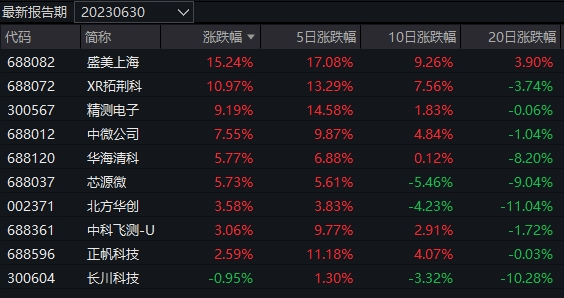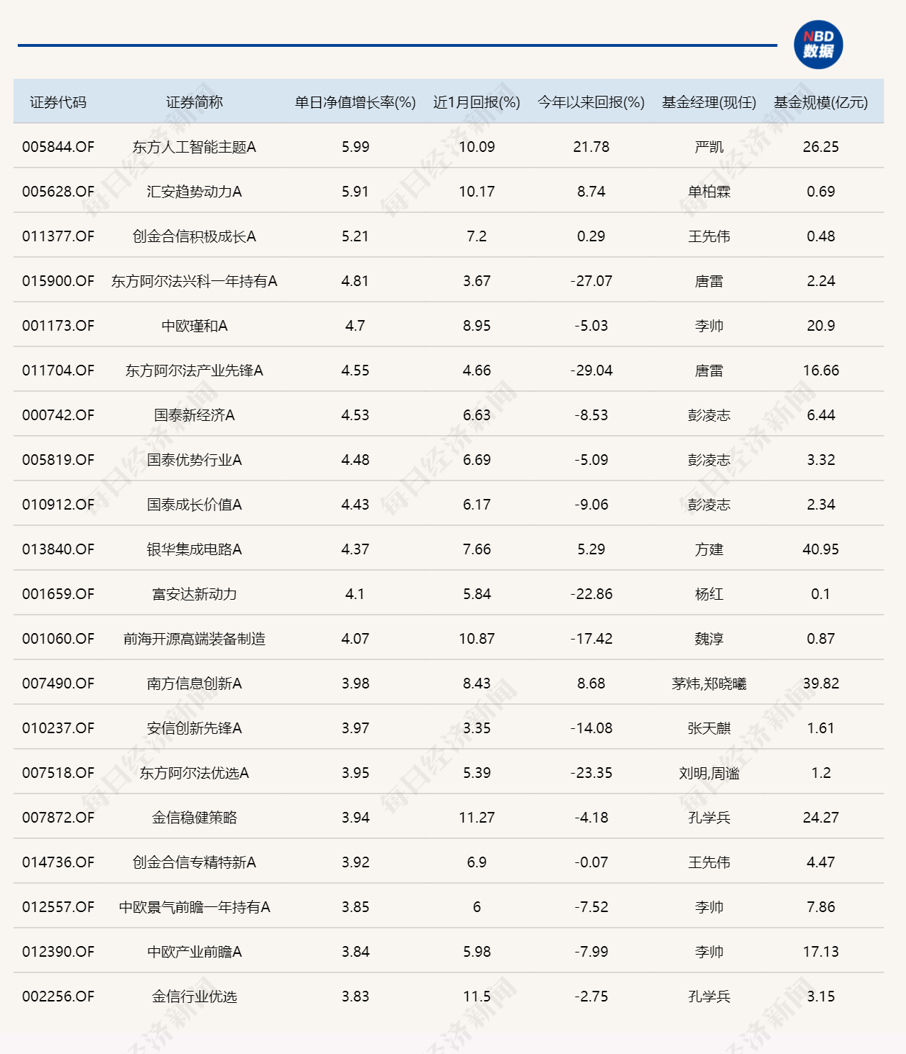 领涨的东方人工智能主题A(5.99%),二季报披露的重仓股包括拓荆科技、精测电子、中微公司、芯源微等,今日基本都有不错涨幅。