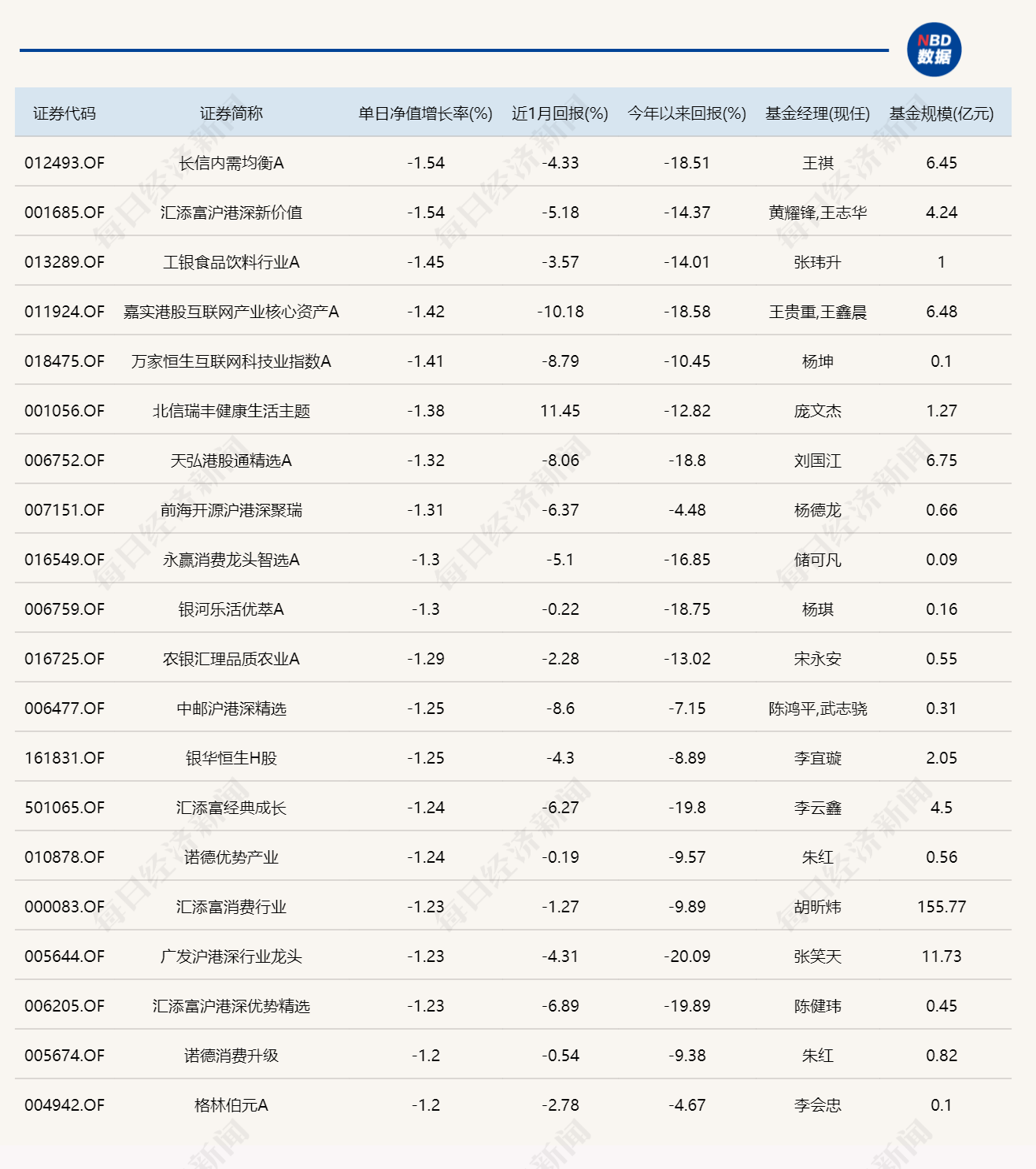 在剔除被动基金表现后,20只领跌的主动基金,单日亏损其实小了不少,普遍不超过1.5%。