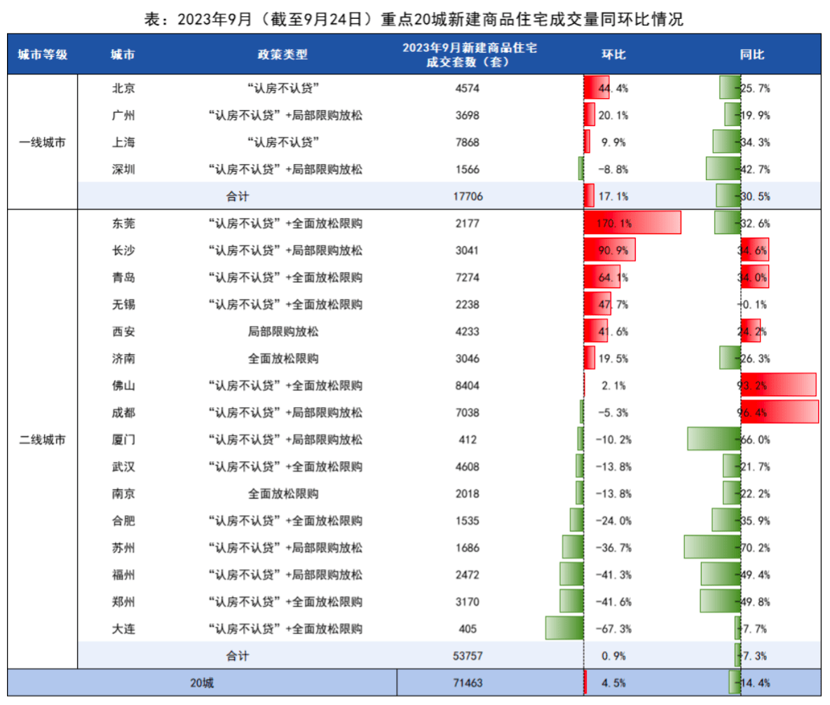 据诸葛找房数据研究中心显示,9月(截至24日),重点20城新建商品住宅成交71463套,环比上涨4.5%,但同比仍下降14.4%。具体到城市而言,调整限购的广州9月新房成交环比涨约20%,长沙则环比增长达90.9%。但作为较早一批全面取消限购的省会城市中,郑州、福州9月新房成交却出现了环比均下降超40%。