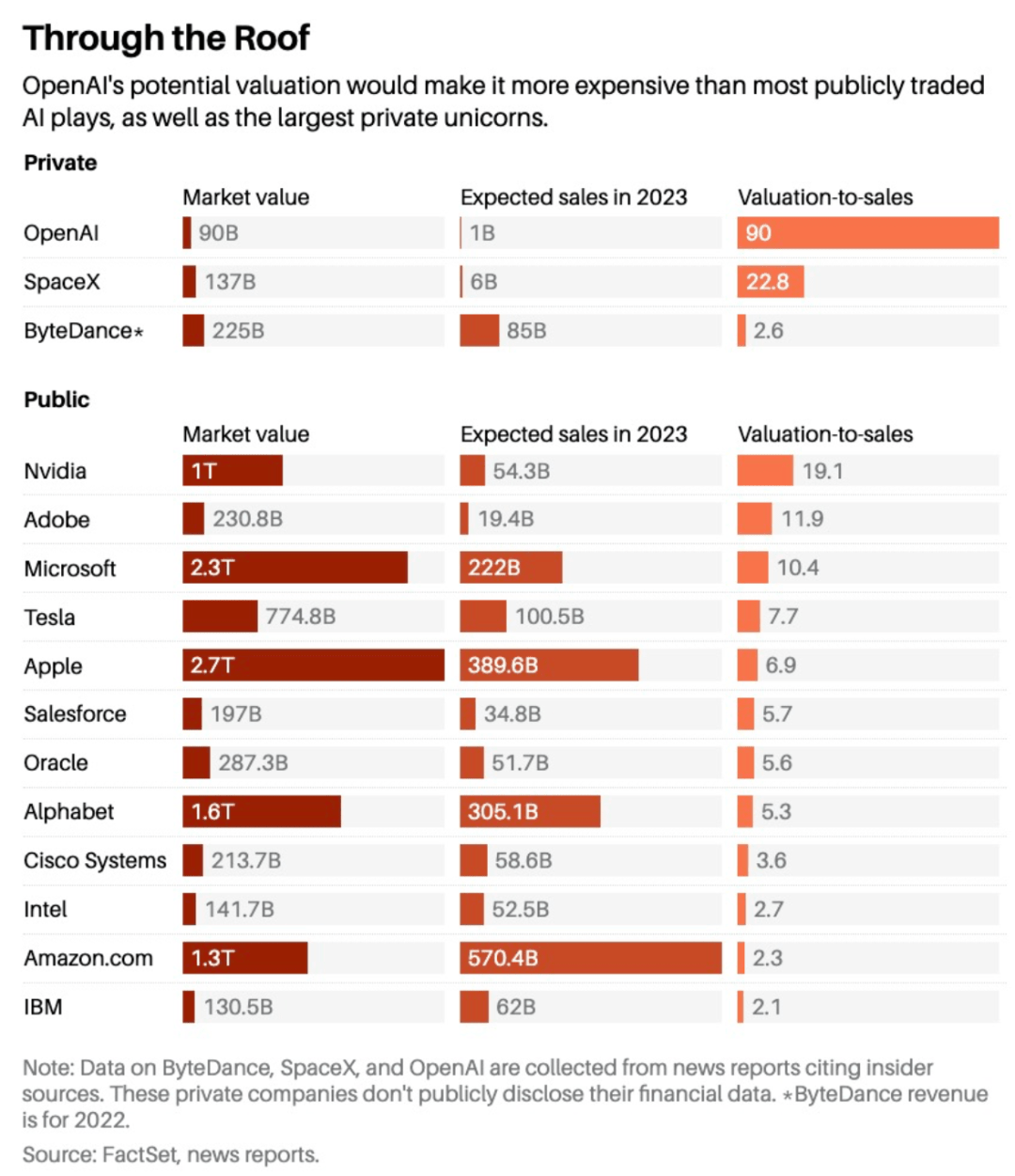 由于非上市公司不必向公众披露财务数据,因此很难将字节跳动和SpaceX的收入与其估值数据进行比较。不过,业内也有一些暗示和透露。