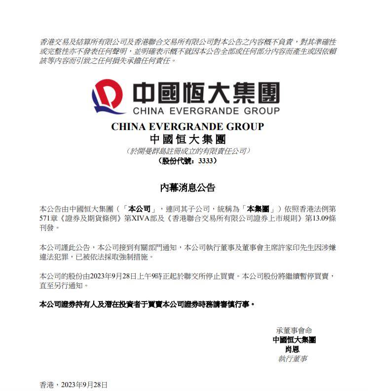 中国恒大9月28日在港交所公告,本公司接到有关部门通知,本公司执行董事及董事会主席许家印先生因涉嫌违法犯罪,已被依法采取强制措施。本公司的股份由2023年9月28日上午9时正起于联交所停止买卖。本公司股份将继续暂停买卖,直至另行通知。