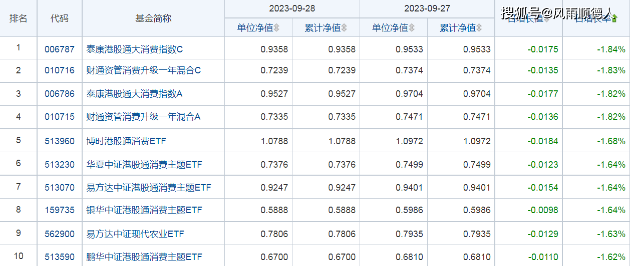 28日开放式基金净值增长排名后10的基金分别是:泰康港股通大消费指数C、财通资管消费升级一年混合C、泰康港股通大消费指数A、财通资管消费升级一年混合A、博时港股通消费ETF、华夏中证港股通消费主题ETF、易方达中证港股通消费主题ETF、银华中证港股通消费主题ETF、易方达中证现代农业ETF、鹏华中证港股通消费主题ETF。