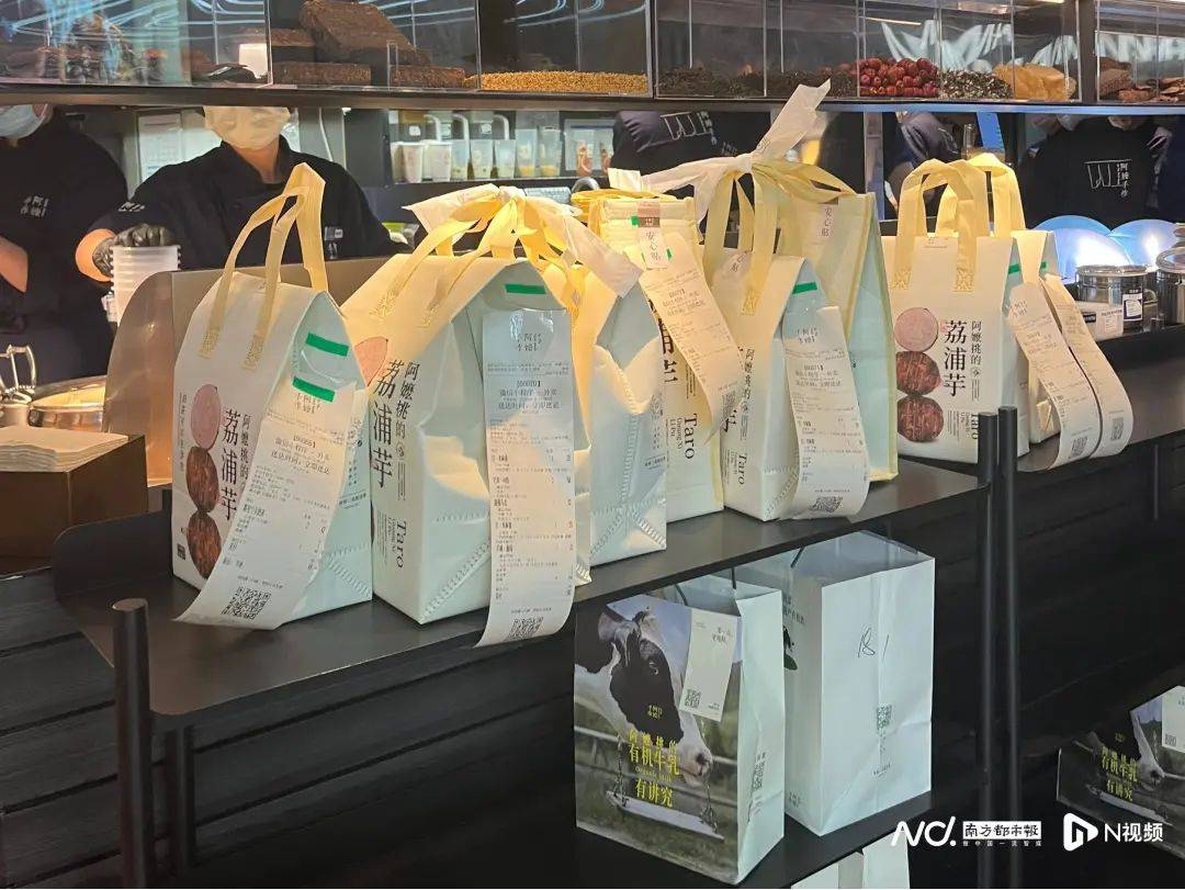 阿嬷手作广州太古汇门店前台摆满了外卖订单的饮品