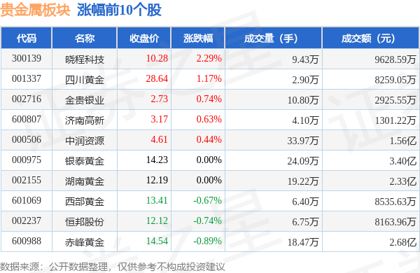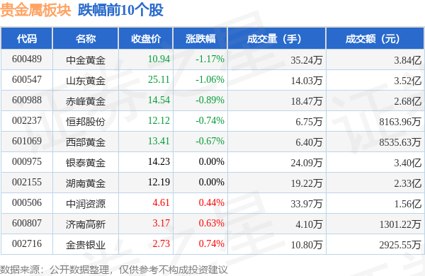 9月28日贵金属板块较上一交易日下跌0.71%,中金黄金领跌。当日上证指数报收于3110.48,上涨0.1%。深证成指报收于10109.53,上涨0.05%。贵金属板块个股涨跌见下表: