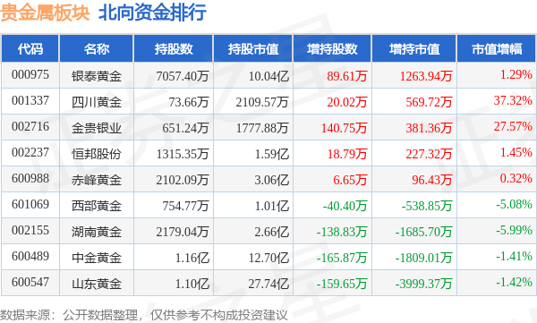 北向资金方面,当日贵金属板块北向资金持股市值为59.19亿元,减持0.55亿元。其中增持最多的是银泰黄金,增持了0.13亿元。减持持最多的是山东黄金,减持了0.4亿元。贵金属板块北向资金持股变动明细见下表: