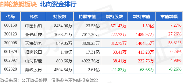 北向资金方面,当日邮轮游艇板块北向资金持股市值为45.03亿元,增持1.94亿元。其中增持最多的是中国船舶,增持了1.59亿元。减持持最多的是海峡股份,减持了68.68万元。邮轮游艇板块北向资金持股变动明细见下表: