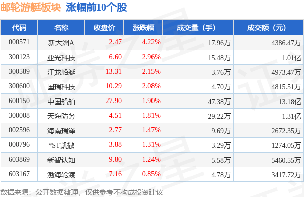 9月28日邮轮游艇板块较上一交易日上涨1.17%,新大洲A领涨。当日上证指数报收于3110.48,上涨0.1%。深证成指报收于10109.53,上涨0.05%。邮轮游艇板块个股涨跌见下表: