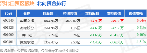 北向资金方面,当日河北自贸区板块北向资金持股市值为12.35亿元,减持289.03万元。其中增持最多的是华夏幸福,增持了249.36万元。减持持最多的是冀东水泥,减持了336.3万元。河北自贸区板块北向资金持股变动明细见下表: