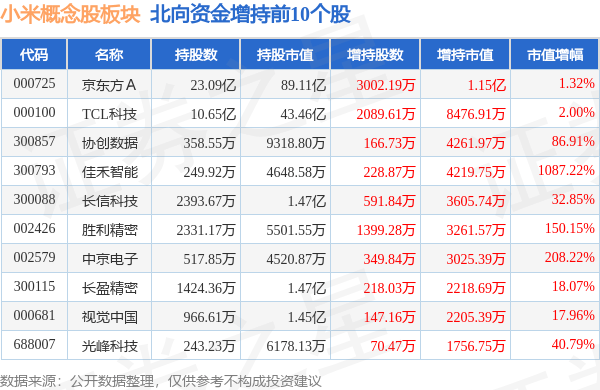 北向资金方面,当日小米概念股板块北向资金持股市值为1419.07亿元,增持3.95亿元。其中增持最多的是京东方A,增持了1.15亿元。减持持最多的是韦尔股份,减持了0.89亿元。小米概念股板块北向资金持股变动明细见下表:
