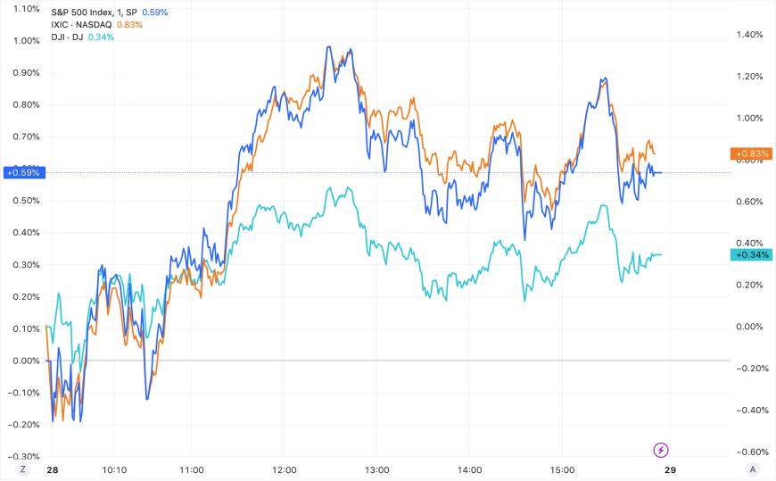 截至收盘,道琼斯指数涨0.35%,报33,666.34点;标普500指数涨0.59%,报4,299.70点;纳斯达克指数涨0.83%,报13,201.28点。