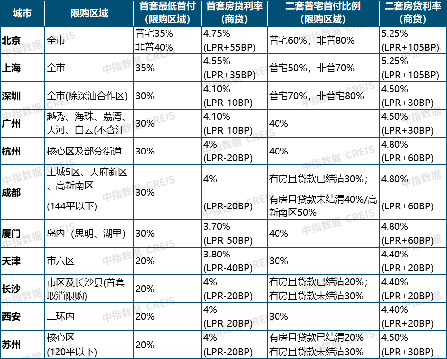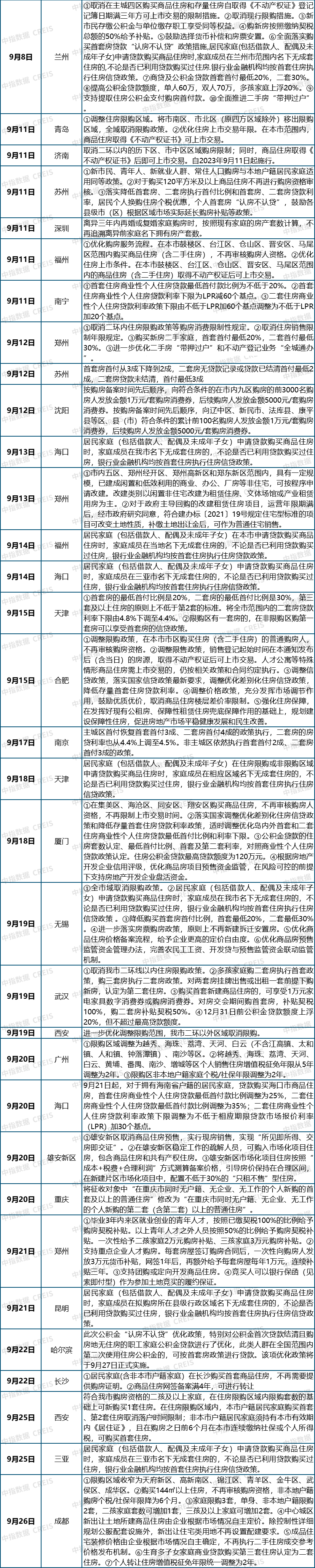 广州、天津、西安、厦门、苏州、长沙、成都等城市收窄限购区域,如9月20日广州限购区域调整为越秀、海珠、荔湾、天河、白云(不含江高镇、太和镇、人和镇、钟落潭镇)、南沙等区。9月26日,成都限购区域调整为天府新区、高新南区、锦江区、青羊区、金牛区、武侯区、成华区。