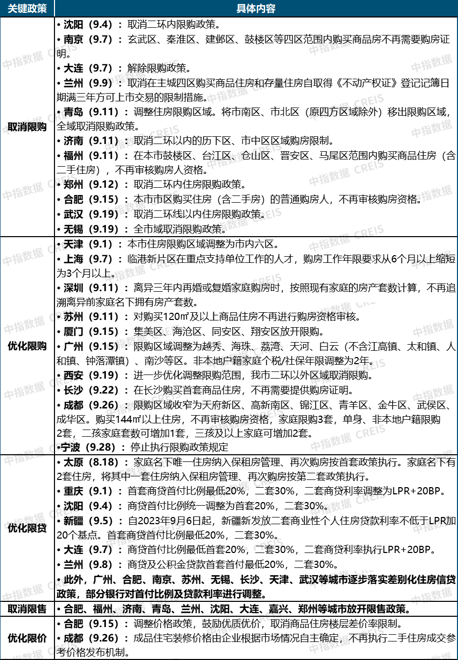 根据中指监测,9月各地放松限购政策主要涉及全面放开限购、缩小限购区域、针对特定面积段取消限购、针对人才或多孩家庭优化限购等方面,多个核心二线城市放开限购,广州成为第一个放松近郊限购的一线城市,均释放了积极的信号。