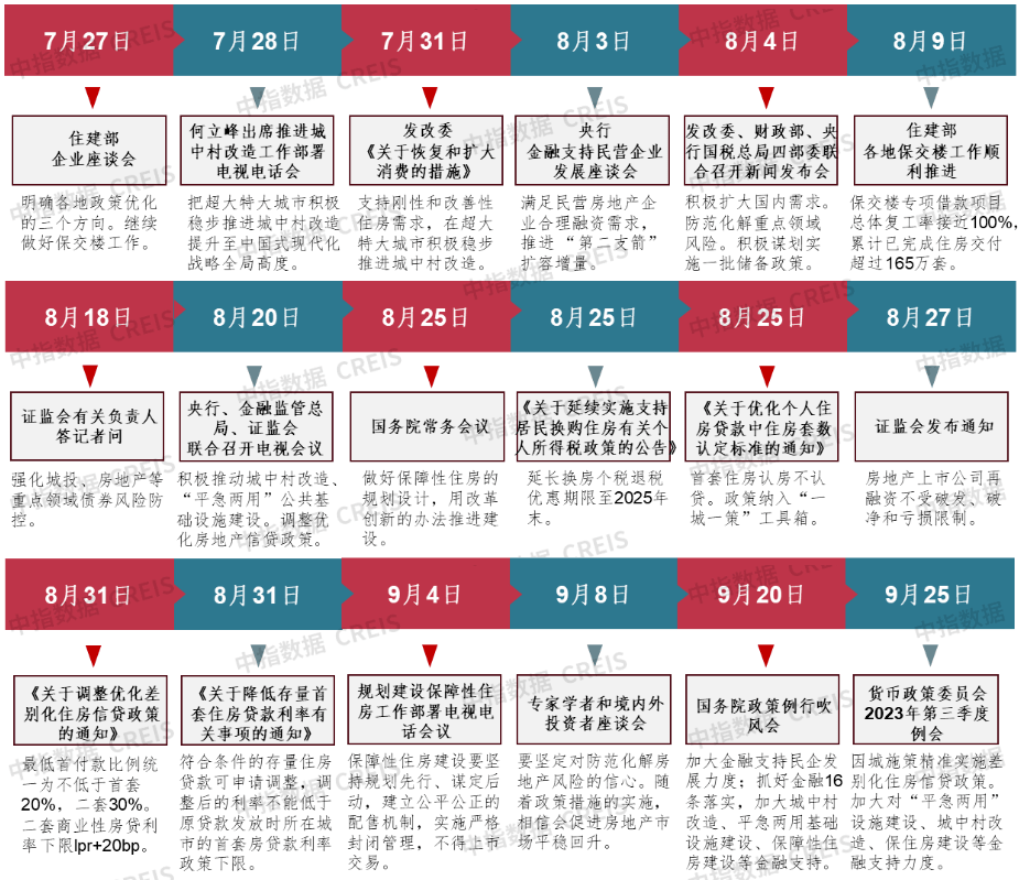 2023年年初房地产市场出现一定修复态势,但二季度房地产市场明显降温,7-8月市场低迷态势未改,房地产市场调整压力不断加大,多地新房、二手房价格均处于下跌通道。房地产市场的持续低迷以及行业风险的积聚对整个宏观经济、金融系统的稳定均带来了不利影响,稳定房地产市场对于稳定宏观经济大盘至关重要。7.24中央政治局会议为房地产定调,8月底多部委落地楼市优化举措,随后一二线城市加入放松限购限贷政策行列,房地产政策底正式到来。本文通过梳理三季度中央及各地落地的楼市政策,进一步分析未来政策还有哪些优化空间和方向,供各界参考。