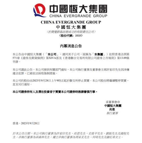 中国恒大9月28日晚间在港交所发布公告称,该公司接到有关部门通知,公司执行董事及董事会主席许家印因涉嫌违法犯罪,已被依法采取强制措施。