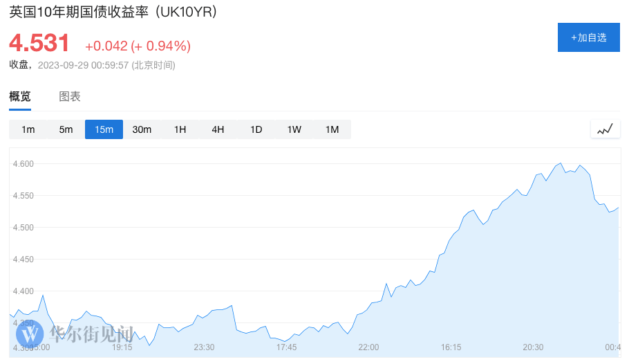 英国10年期国债收益率也一度跃升20个基点,至4.57%,为今年2月以来的最大单日涨幅,最终收于4.48%。