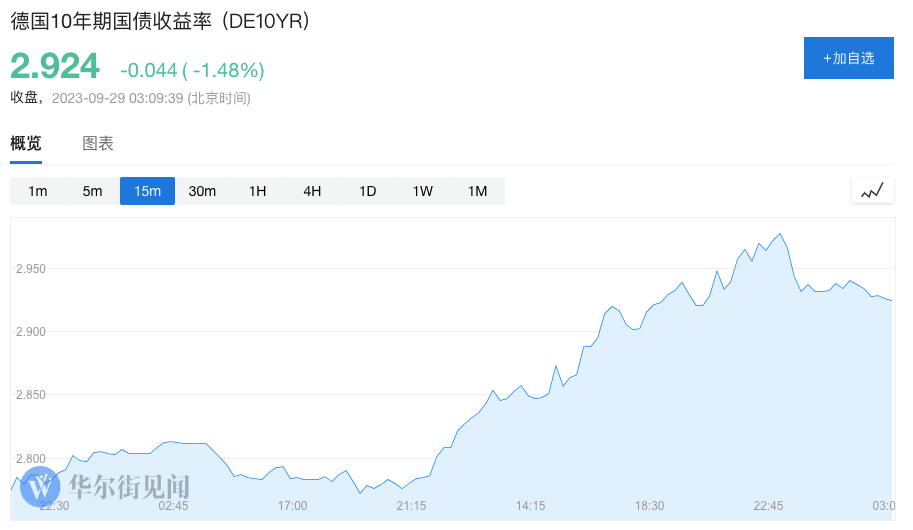 欧元区基准的10年期德债收益率最高涨14个基点至2.98%,十二年来首次接近3%。西班牙10年期国债收益率自2013年以来首次突破4%。衡量风险情绪的意/德国基债息差升至200个基点创半年最阔,达到自3月份美国银行业危机以来的最高水平。