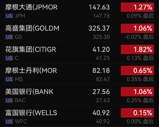 周四银行股集体上涨,摩根大通涨1.27%,高盛涨1.06%,花旗涨1.82%,摩根士丹利涨0.65%,美国银行涨1.06%,富国银行涨0.15%。