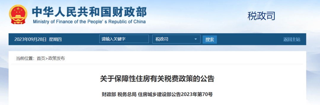 9月28日,财政部、税务总局、住房城乡建设部发布《关于保障性住房有关税费政策的公告》。