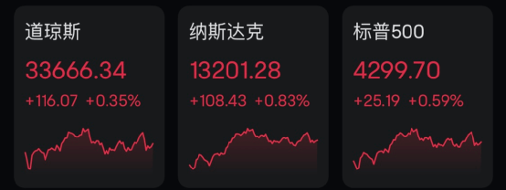 道指涨116.07点,涨幅为0.35%,报33666.34点;纳指涨108.43点,涨幅为0.83%,报13201.28点;标普500指数涨25.19点,涨幅为0.59%,报4299.70点。