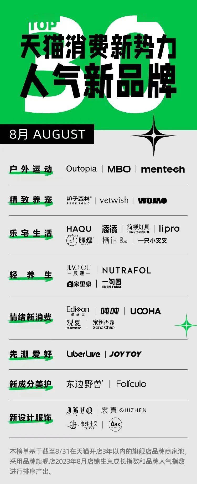 在9月20日,天猫发布了8月“天猫人气新品牌TOP 30” 榜单,过去三年,有300多个入驻天猫不到3年的新品牌成交规模跃升至千万级阵营,有15个新品牌则迈入了亿元俱乐部。