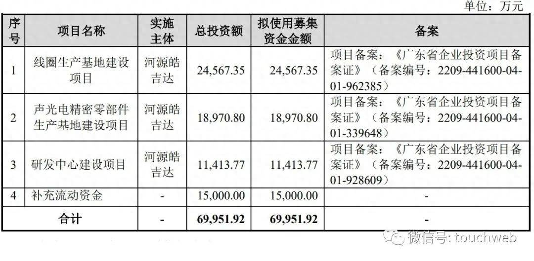 皓吉达计划募资7亿元,其中,2.46亿元用于线圈生产基地建设项目,1.9亿元用于声光电精密零部件生产基地建设项目,1.14亿元用于研发中心建设项目,1.5亿元用于补充流动资金。