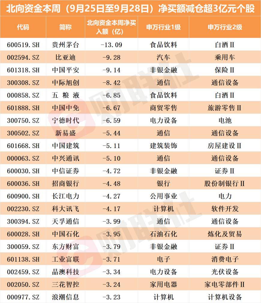 卖出方面,本周北向资金净卖出超3亿元的个股如下表。贵州茅台遭受“甩卖”,净卖出额为13.09亿元,比亚迪、中国平安均减仓超9亿元。
