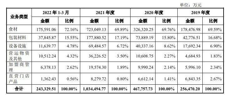 《招股书》显示,2021年,蜜雪冰城来自食材和包装材料业务的营收分别为72.3亿元和17.79亿元,分别占总营收的69.89%以及17.19%。简而言之,蜜雪冰城并不直接承担门店的各项成本,只向门店供应原材料,进而可以通过规模化效益赚取营收。