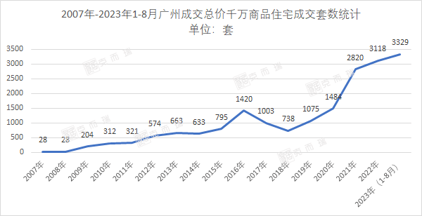 克而瑞数据显示,2023年1-8月广州总价1000万以上新房共成交3329套,仅用8个月就超过去年全年(3118套),不仅如此,还创下近十年新高,见下图: