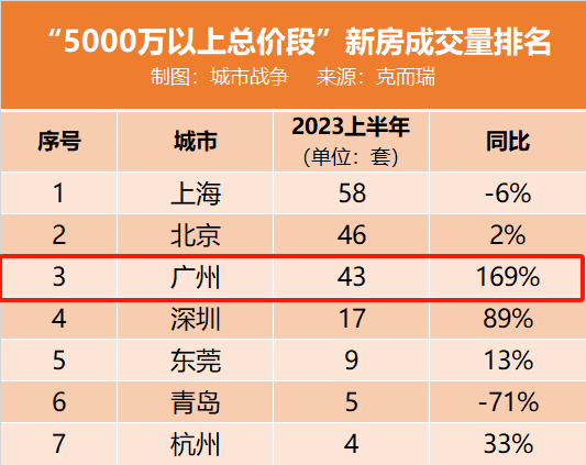 3、总价越高,广州越能打。千万级豪宅成交量,广州排名全国第五,但3000万以上豪宅成交量,广州排名全国第三,超过深圳杭州。5000万以上豪宅成交量,广州更是与深杭拉开差距。