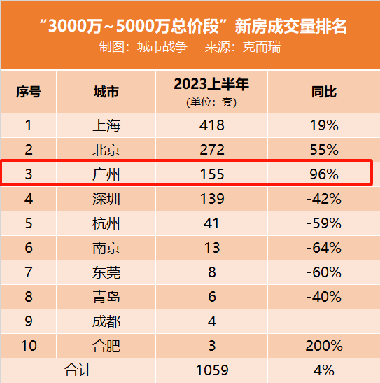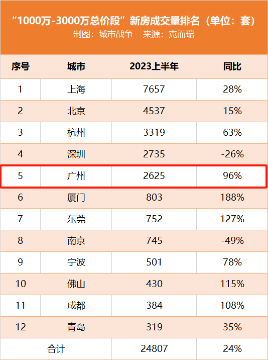 以下是2023上半年各大城市1000万-3000万新房成交量,见下图: