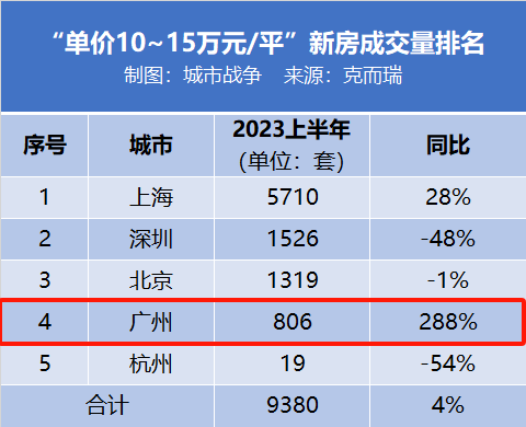从成交增长情况看,广州堪称一枝独秀,同比大增288%。