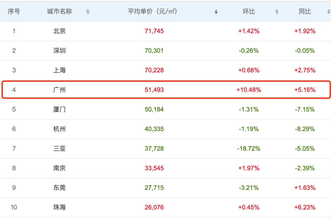 以上是来自中国房价行情网的数据,广州房价均价排在内地城市第四名,略高于厦门。