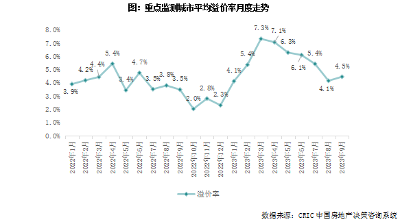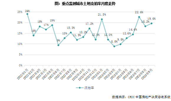 9月,重点城市土地出让频次明显较少,仅有广州、杭州、宁波等少数城市进行了集中土拍,9月份土地成交规模如期回落。热度方面,广州、杭州、宁波等市均在月内举行了土拍,月份平均溢价率4.5%,较上月小幅上升0.4个百分点,但仍为2023年3月以来第二低点。三季度以来,不仅溢价率指标出现下降,流拍率也处于相对高位,深圳、杭州、南京、合肥等热点城市均出现流拍现象。重点城市9月份流拍率升至19.6%,环比上月再度攀高1.4个百分点,土地市场明显降温。