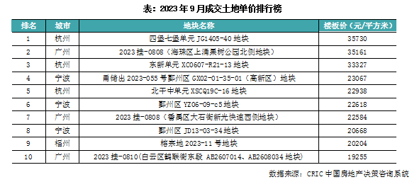 2023年9月,广州、杭州、宁波等部分城市进行了集中土拍。总价榜榜首地块来自广州海珠区,为综合地块,成交总价为127.9亿元,由中海摇号竞得,溢价率高达15%;排在第二位的是杭州四堡七堡单元JG1405-40地块,该地也是单价榜榜首地块,经过36轮竞价达到封顶摇号,摇号阶段吸引了滨江、杭州兆兴、浙江建杭、杭州益乐实业4家房企参与竞争,最终,建杭置业摇中该地,楼板价35730元/平方米,溢价率12%;排在第三位是宁波鄞州区JD13-03-34地块,经过62轮竞价至封顶总价23.6亿元,溢价率达14.82%,最终该地被保利摇号竞得。