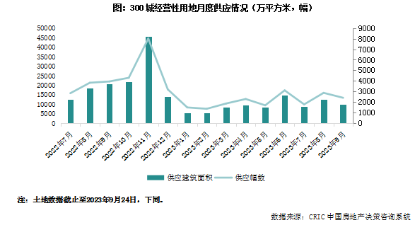 土地供应方面,新增供地规模创近十年的9月份新低。就往年供地的历史数据来看,2017年以来每一年9月份的供地规模都在2亿平方米以上,而截止2023年9月24日,本月土地供应量仅为9962万平方米,较上年同期降幅达到36%。与上月预计一致,随着大部分城市第二轮预公告截止时间的临近,9月份供地规模延续边际改善,预计全月环比微增,但是同比来看依旧维持低位运行。一线城市方面,本月北京、上海、广州均有宅地供应,含宅用地总建面积437万平方米,其中六成来自于上海。二线城市方面,长沙、南京、武汉、合肥等23市于月内发布了宅地供应公告,与上月类似,各城市平均供地规模不高,仅有西安、济南宅地供应建面超过100万平方米,且两地2023年前三季度供地进度均相对缓慢,西安预供地清单完成率仅三成左右,济南供地计划完成率更是不足二成。随着四季度的来临,年末地方基金性收入压力进一步增加,预计接下来土地供应量将维持年内高位,但是基于稳定市场预期、避免同质化竞争预期,同比来看供应规模仍将维持历史低位。