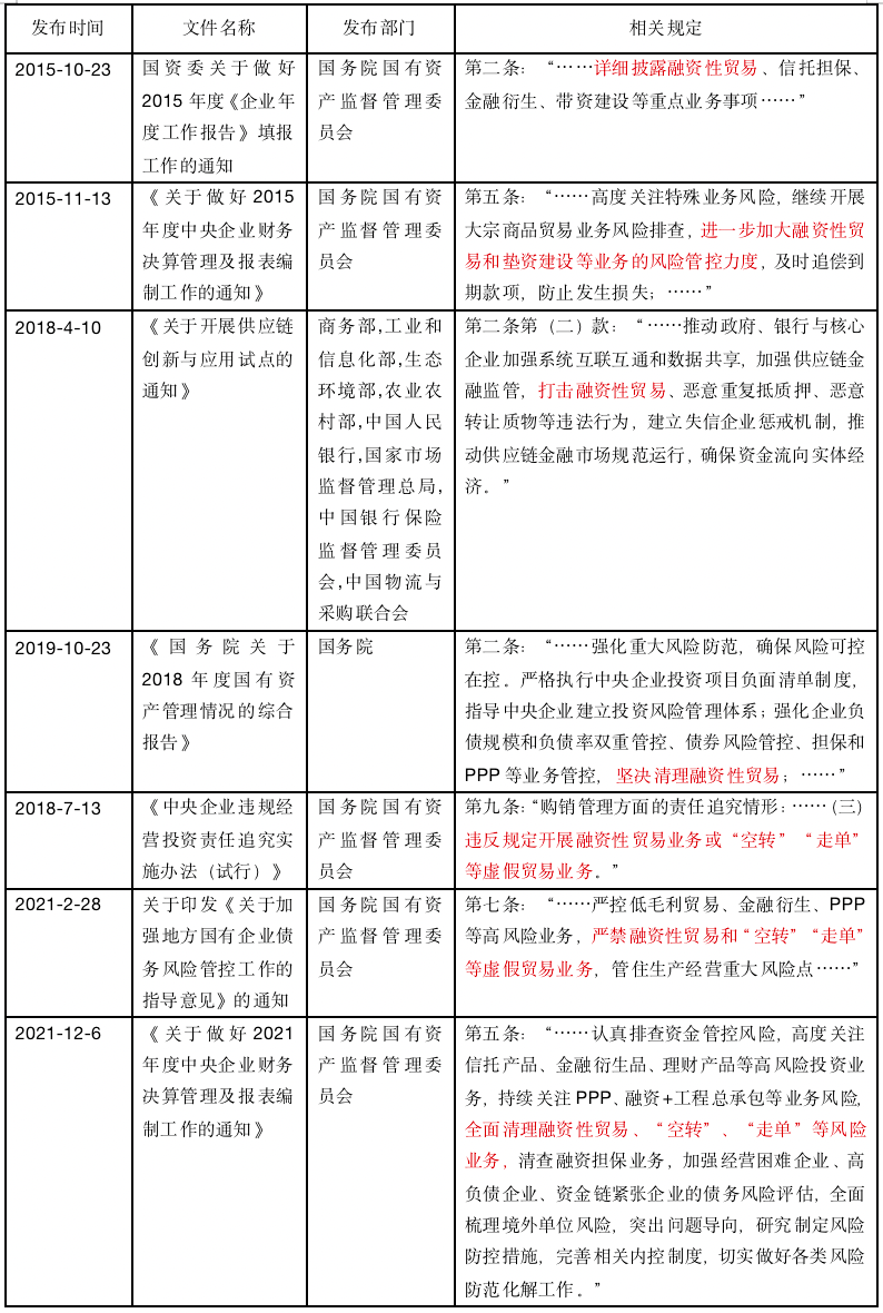 国企最早涉及融资性贸易业务的文件包括2013年国务院国资委《关于进一步加强中央企业大宗商品经营业务风险防范有关事项的紧急通知》等,近年来明确提到“融资性贸易”的文件梳理如下: