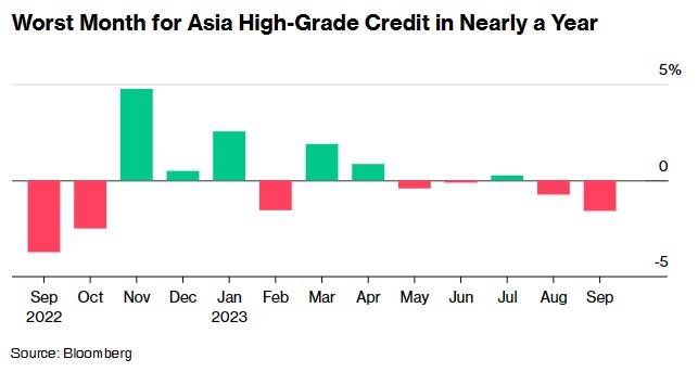 受美国高利率及能源成本上升等因素的影响,以美元计价的除日本以外亚洲地区的投资级公司债券指数9月以来下跌了近1.6%,为2022年10月以来最差的月度表现。