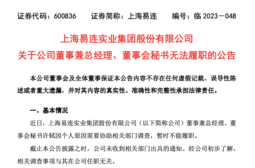 9月26日晚,上海易连(600836)公告,公司董事兼总经理、董事会秘书许轼因个人原因需要协助相关部门调查,暂时不能履职。
